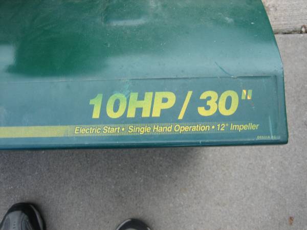 A nice 30 inch, 8 h.p., snow blower. Electric start, self propelled. Usually starts right up at first push of the starter button. Cash at pickup.
