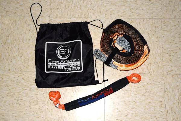(1) Gear America Heavy Duty Tow Strap 35,000 LBS. Minimum Breaking Strength 3" wide x 20' long (1) Gear America 1/2" Synthetic Soft Shackle 45,000 LBS. Breaking Strength 1/2" x Approximately 20"...