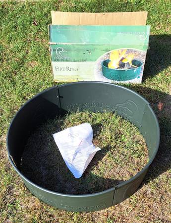 New in box fire pit ring with hardware and instructions. 28" diameter x 8" tall with rolled edge.