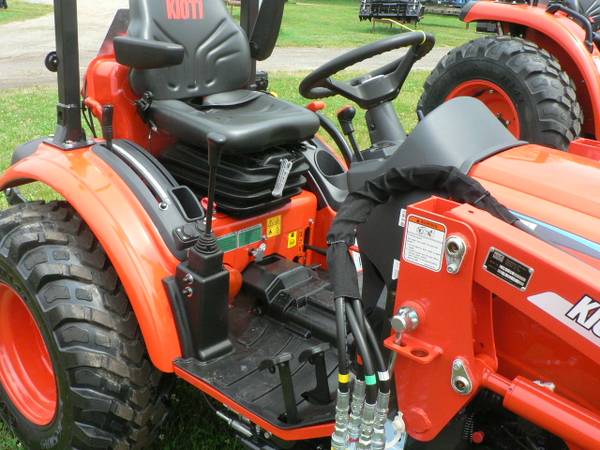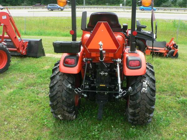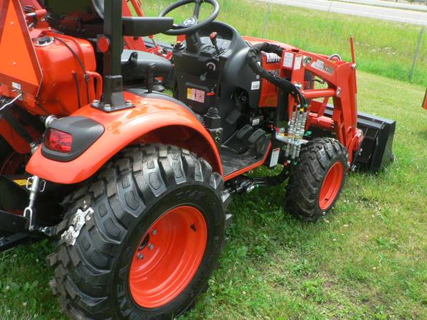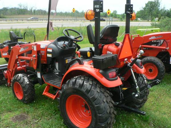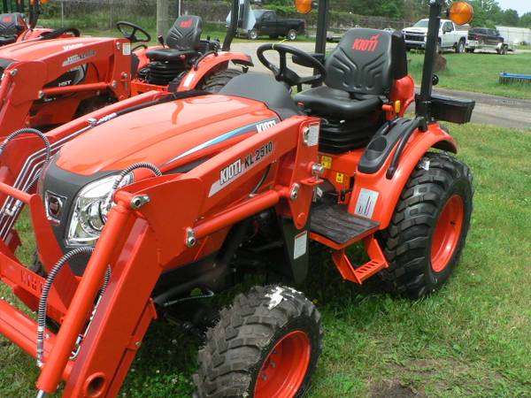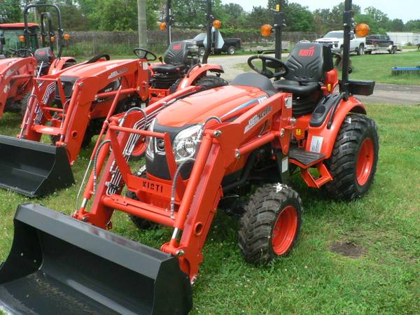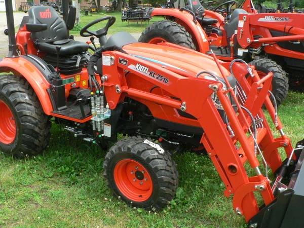 New and in stock, 24.5hp diesel, 4x4, tractor with KL2510 quick attach loader with 48" universal mount quick attach bucket, 2 range hydro transmission, separate forward and reverse peddle, power steering, category 1 three point hitch, adjustable suspension seat with seat belt, folding roll bar, tool box, Goodyear R14 tires, call for detail on price and financing