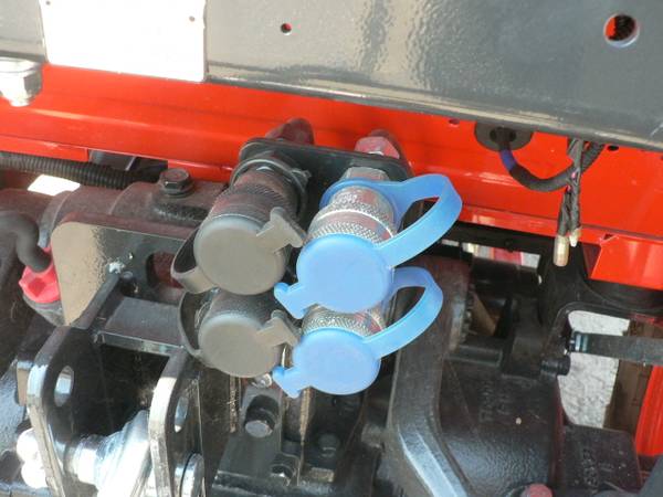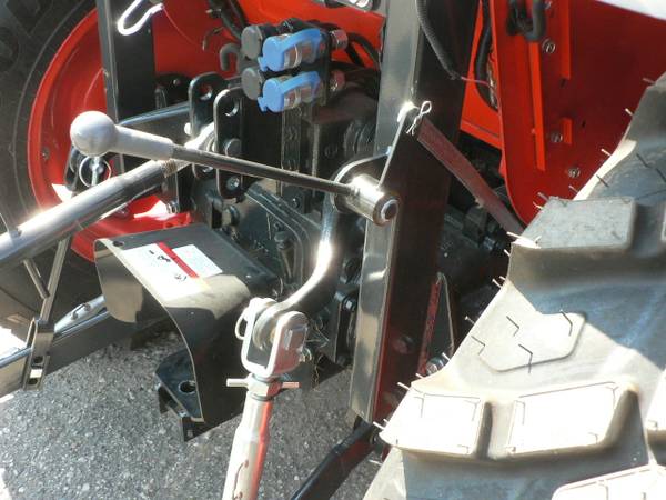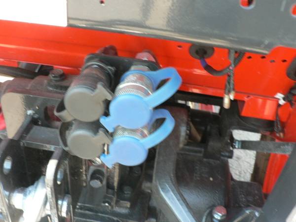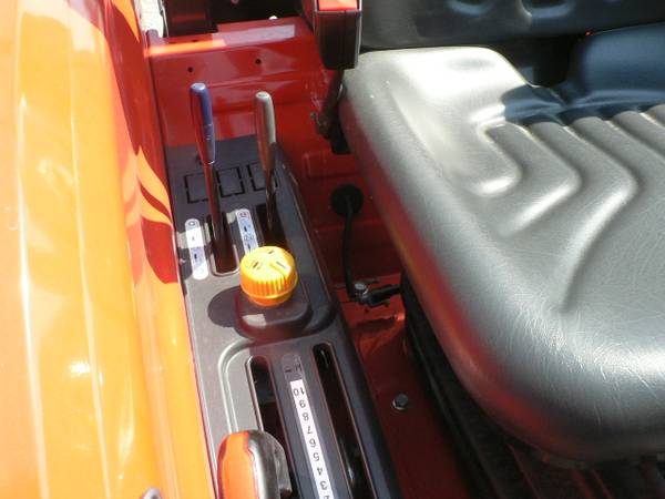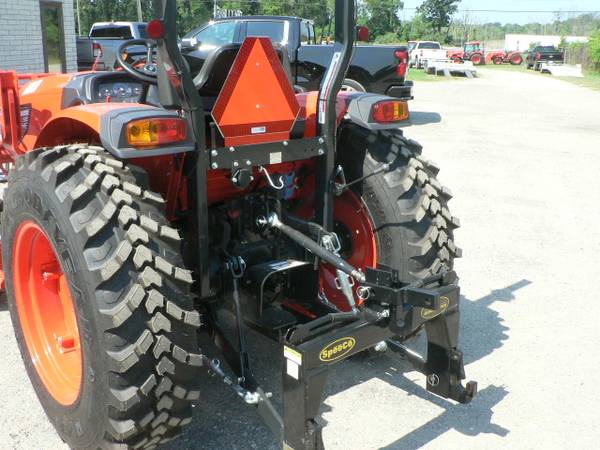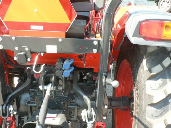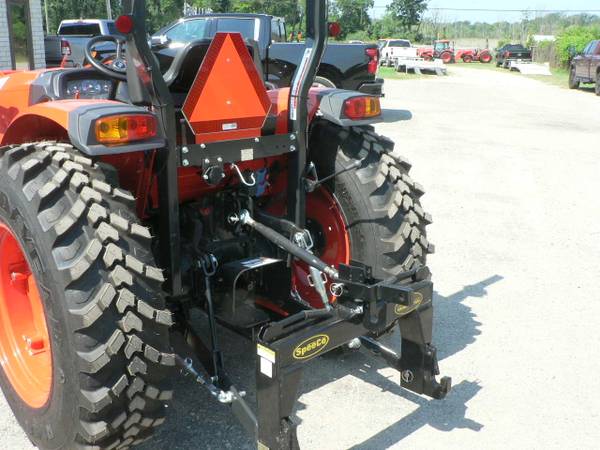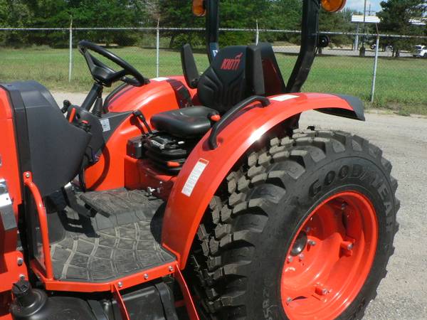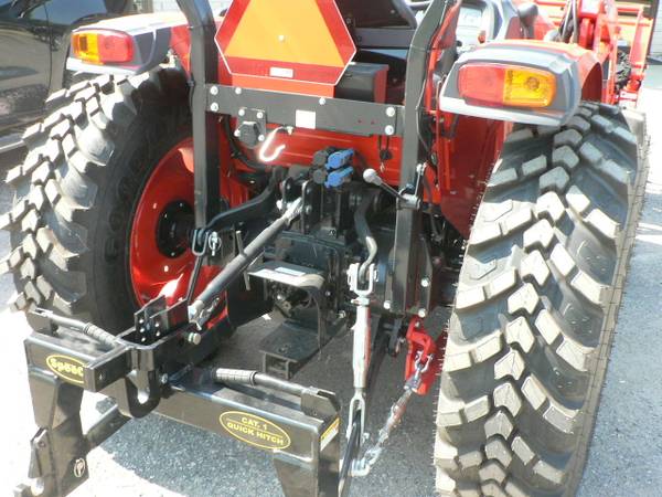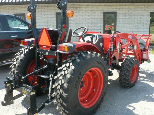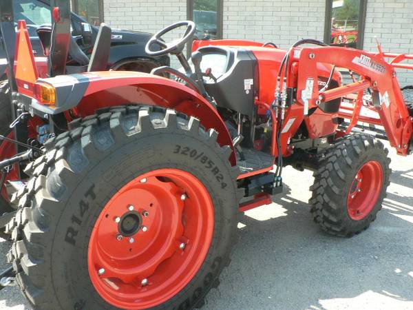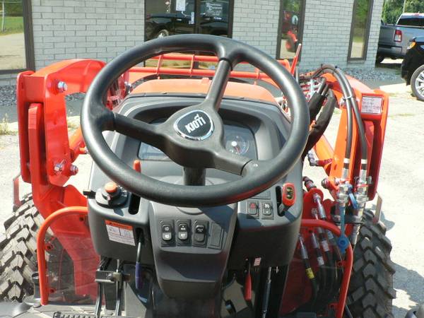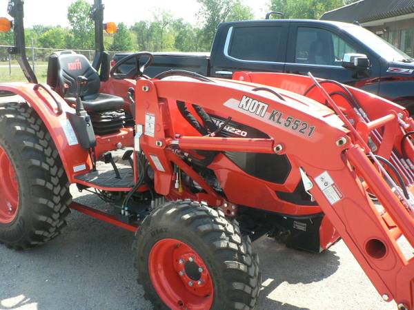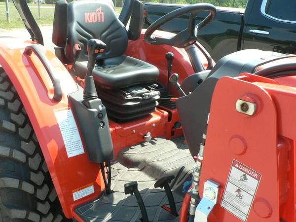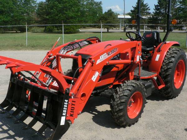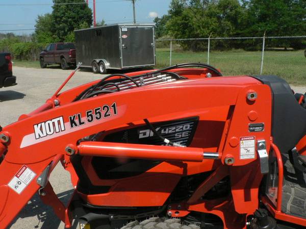 New Kioti DK4220HSe tractor loader, approximate 40hp diesel, power steering, 4x4, Kioti 5521 quick attach loader with universal mount quick attach bucket, shown with optional 3rd function front remote hydraulics, 54" Kioti grapple , dual rear remote hydraulics, rear three point quick hitch, cruise control, and many more features. R14 radial tires