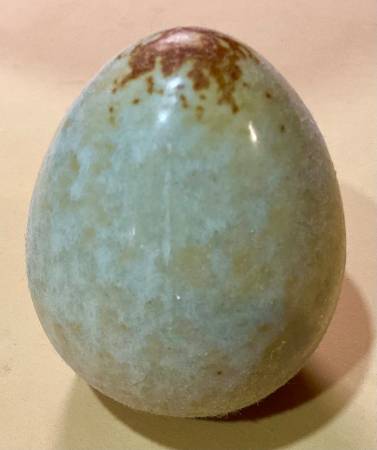The eggs are artfully made with ceramic glazes of gray, hints of blue, and speckled with brown.