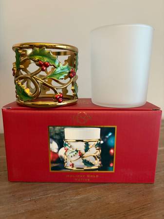 Elegant Holiday votive with gold and green holly. New. Only taken out of box for this photo. I have 2 more for sale if you’d like a grouping. Also makes a great hostess gift.