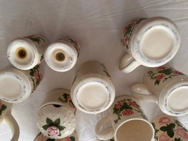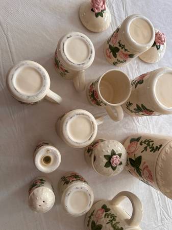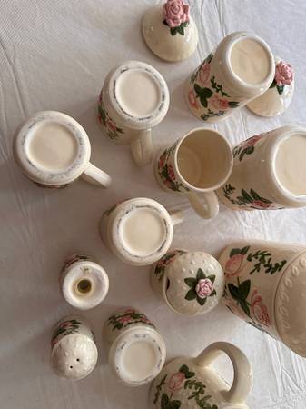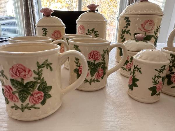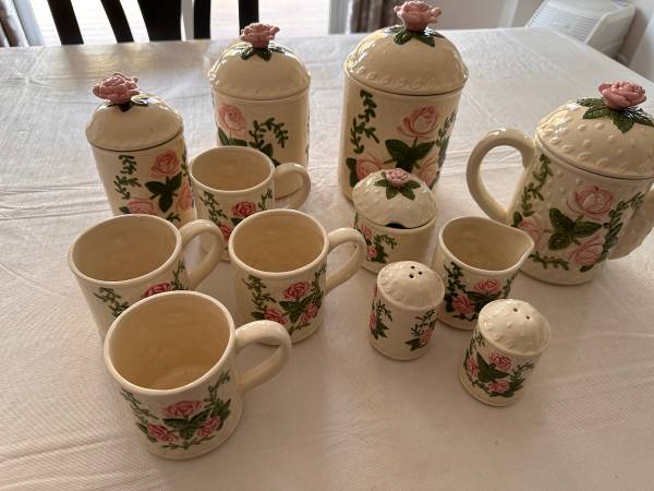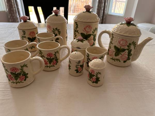 Ceramic Tea set including Tea pot, 4 cups, creamer and sugar bowl. Also has 3 matching canisters with a salt and pepper shaker.