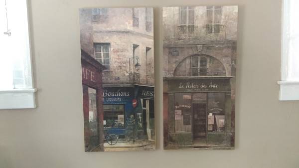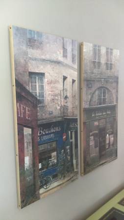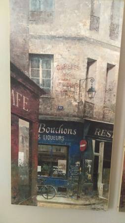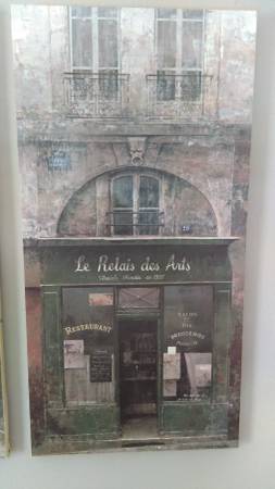French Storefront Scenes - Canvas Transfers, set of 2 Le Bouchons & Le Relais des Arts Large Canvas Transfers, each transfer is 16:" x 31 1/2" x 3/4" deep In great condition. Cash only.