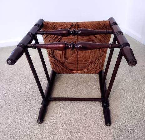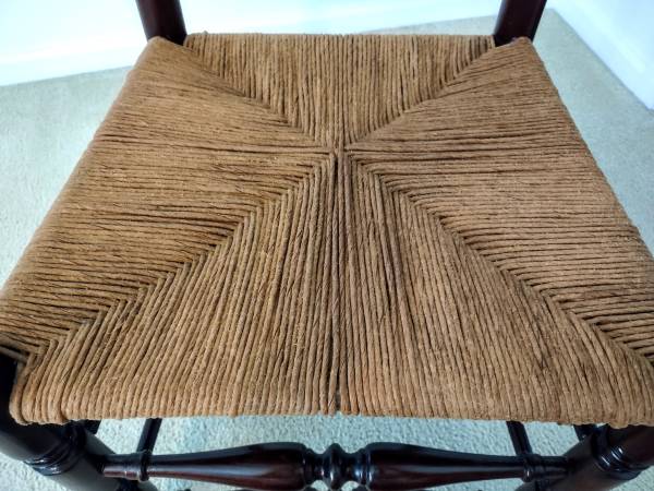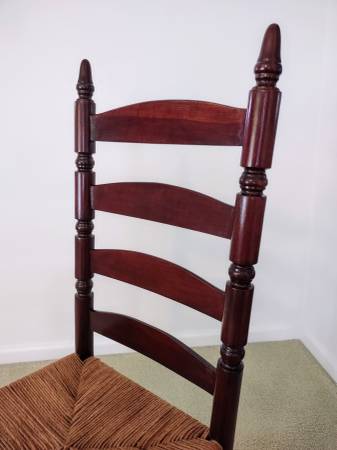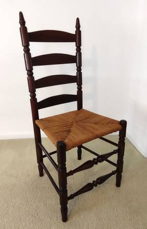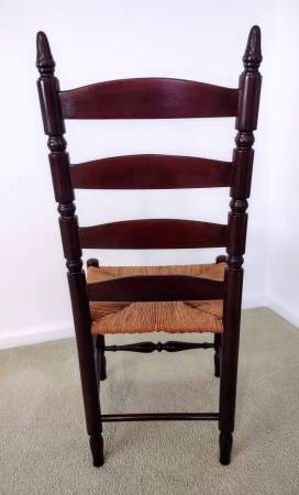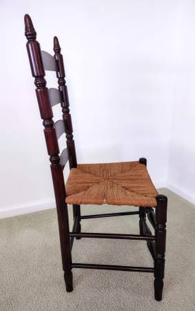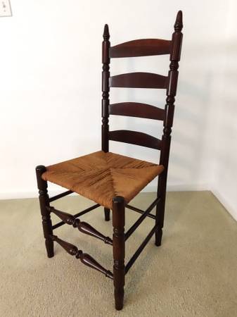 You are viewing a beautiful antique, Early American, ladder-back chair with a woven rush-style seat. The chair has been in the family for many years and a family member refinished and restored the chair, including the rush-style seat several years ago. It is made of cherry wood and has a coating of polyurethane. Also, the measurements are as follows; seat height - 19", seat width - 18 1/2", seat depth - 16 1/2", chair height - 41 1/2", and the backrest height is 24".
