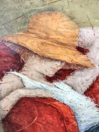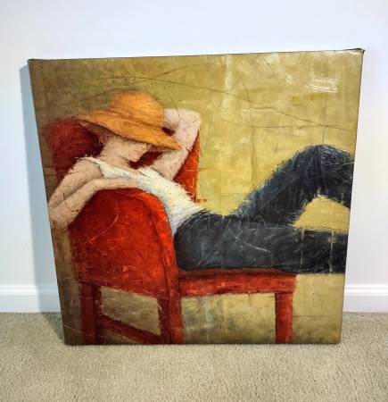 You are viewing a pre-owned, canvas reproduction, art piece entitled, "Second Thoughts." The original piece was created by reknowned artist, Erica Hopper and it is in very good condition with some wear around the edges. It measures 24" x 24" and would look great with other similar artwork in your home or office!