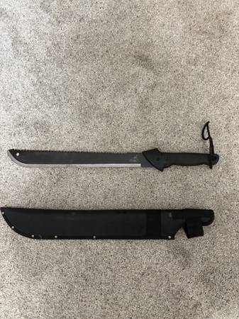 This is in good condition. Total dimension is 25.75 x 4.25 x 1 17 1/4" blade Lanyard Black nylon belt sheath
