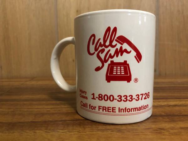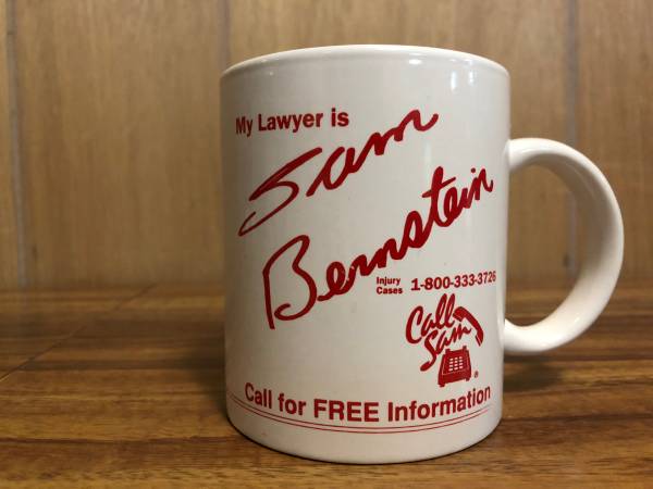 Mug featuring "Call Sam" with logo of touch tone desktop telephone on one side and "My Lawyer is Sam Bernstein" with the same logo (only smaller) on the other side. Also has toll free phone number.