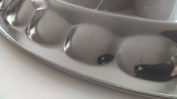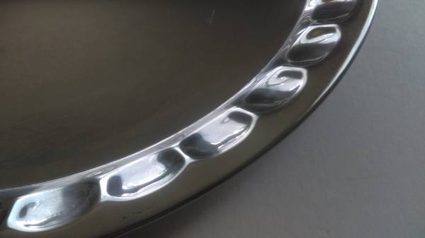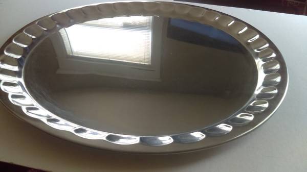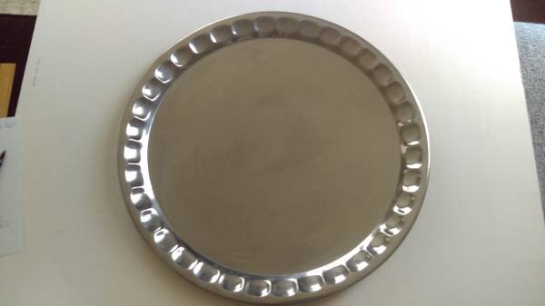 Serving Tray with edge detail. Dimensions: 18 5/8"dia x 3/4"deep. In good condition, has one minor dent in flat area. As Is. Cash only.