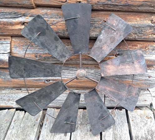 Rustic windmill fans for wall hanging with hooks included. 9 blade, 24" diameter - $30/ea 12 blade, 22" diameter - $35 12 blade with tail, 32" diameter, overall length 50" - $70
