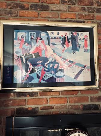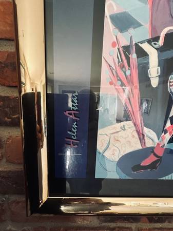ABSTRACT ART POSTER UNDER GLASS FRAMED IN GOLD. LIKE NEW NO DAMAGE, NO ODOR, NO FADING SIZE 38 INCHES WIDE AND 26 INCHES HIGH.