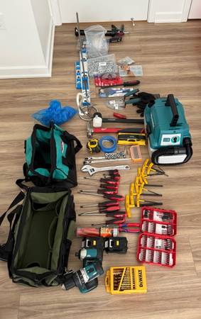 • Pro tool setup (Makita drills, Franklin M210 stud finder, clamps, anchors, Empire levels)