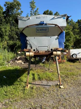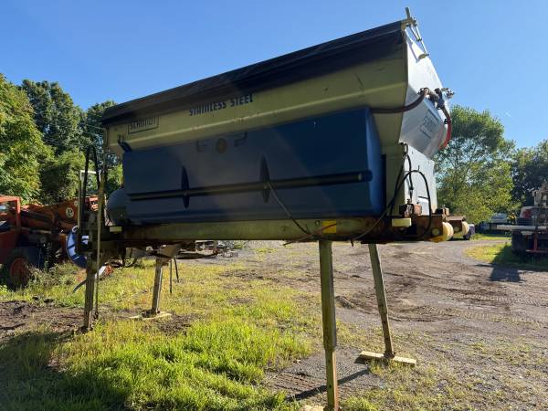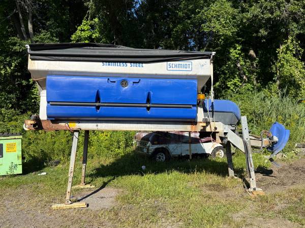 Conveyor belt salt spreader, Stainless steel hopper holds 7.8 cubic yards, Pre wet system holds 580 gallons of deice fluid, Roller tarp cover, Hinged front legs for easy install/removal, can be used for gravel/dirt/sand/etc., No controller, Good condition.