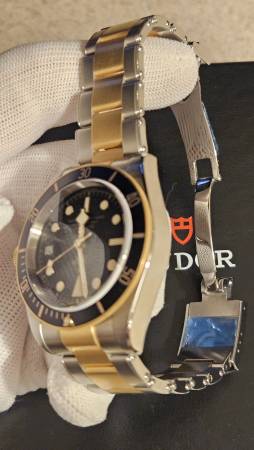 Yellow gold screw-down winding crown, with the TUDOR rose engraved and lacquered in black, with black anodized aluminum winding crown tube