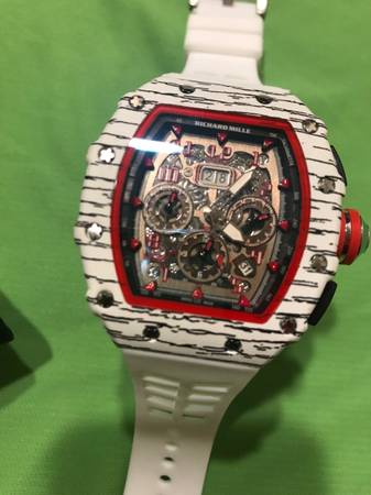 Automatic/RMAC3 Calibre Movement w/hours, minutes, seconds, flyback functioning chronograph, 60-minute countdown timer at 9 o'clock, 12-hour totalizer, oversize date, month indicator and variable-geometry rotor, 50mm White Carbon Case & Bezel, Water Resistant to 5 ATM, Sapphire Crystal, Skeletonized Dial w/Arabic Numerals, Closed Caseback, White Rubber Bracelet, Double-fold clasp, 55 Hour Power Reserve.