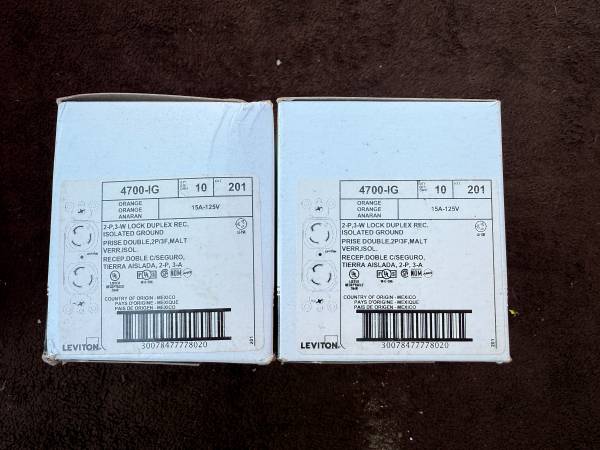 Leviton 4700-IG Twistlok Isolated Ground Duplex Receptacles (Qty-20) • Lot of 20 • Leviton 4700-IG Twist-lok Isolated Ground Duplex Receptacles (Qty-20) Sold as is - No warranty either expressed or...
