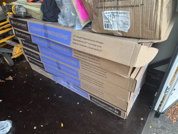 Selling six (6) boxes of CertainTeed Cedar Impressions Siding (18 sq. ft. per box) plus one box of matching corners. This was a special-order purchase — premium quality siding designed to replicate the look of natural cedar with the durability of vinyl.