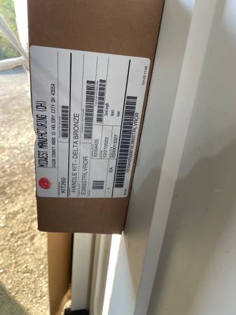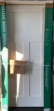 New 36x80 pre-hung, white fiberglass 3 panel Mission exterior door, composite frame, no brickmould, right in-swing. Includes Quanex 3-point locking system with bronze door handle. Door #754. Cash...