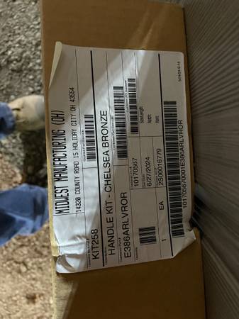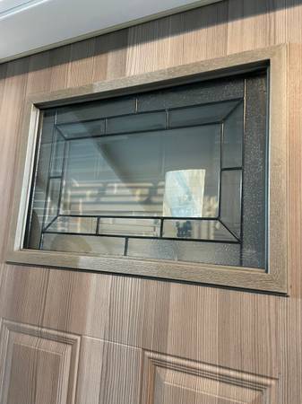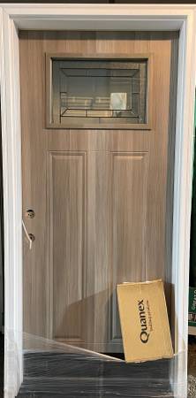 New 36x80 pre-hung, pre-finished weathered gray steel exterior door, 6.5” jamb, decorative glass, composite frame and brickmould, includes 3-point locking system with bronze handle kit, black kick plate on outside bottom of door, right in-swing. Door #863. Cash and carry. 313-608-95 six one