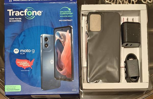 - Brand new Motorola Moto G Play 2024 (XT2413V) 64GB storage with case, charger, charging cord, etc.