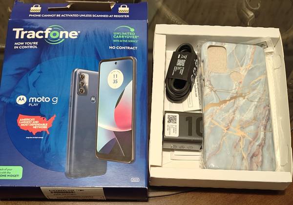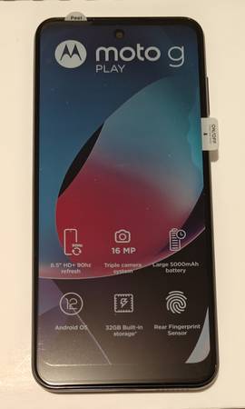 - Brand new Motorola Moto G Play 2023 (XT2271DL) 32GB storage with case, charger, charging cord, etc.