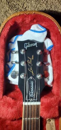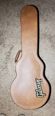 Comes with shoulder strap, allen wrench, Gibson-branded case, split coil humbuckers (JB 57 pups), and slim taper neck (no baseball bat necks tolerated here).