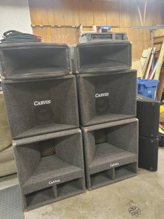 For sale is a Carvin 1330 pa system in outstanding condition complete with an Audio Technica 6 channel mixer and a Carver 1250 high current amplifier. also includes the Carvin wedge monitors. This system will project out clean sound to over an acre in the open or great for use in a medium to large club setting. $700.00 or best offer.