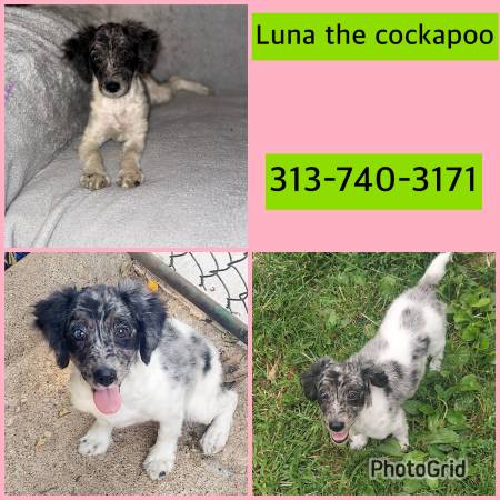 I have a female cockapoo that is six months of age. Her name is Bella and she is very smart laid-back low energy. She is hypoallergenic and she is already as big as she is going to get for the most part. She is half cocker spaniel and half miniature poodle, her color is white and Merle. She is fully vaccinated. She is micro chipped, and I have her shot record in hand.