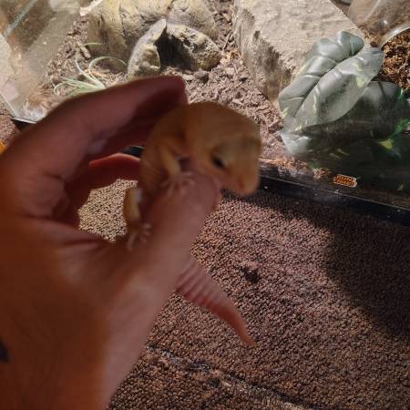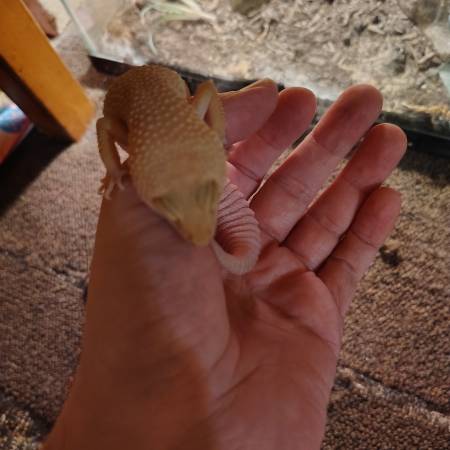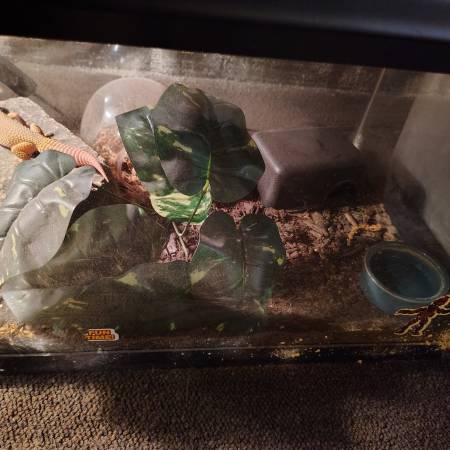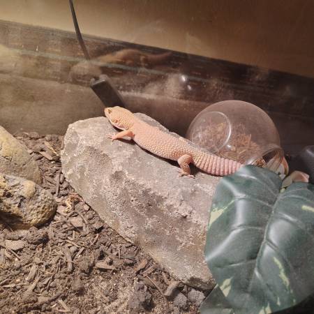I unfortunately have to re-home my leopard gecko. I'm not sure of the sex but their around 2 to 2 and a half years old. Will come with the tank and everything pictured including the heat lamp. I have held them daily, has a very chill temperament and loves to climb up you. I am asking for a small rehoming fee of $40 to ensure they go to a good home