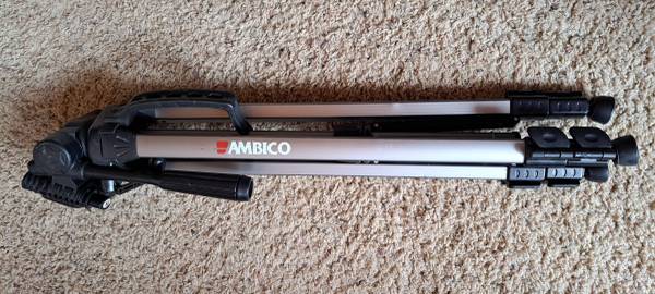 Ambico camera tripod with 3 way pan head and quick release camera lock. Leveling bubble and carrying handle on base. One handed operation leg extension locks. Everything operates as intended.