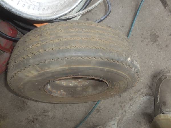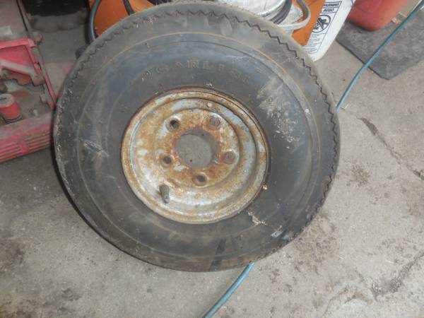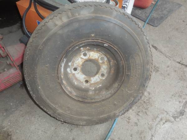 Found this while cleaning up at my building. It was from an electric truck used in auto plants to move products to vending machines I used to service. Not sure if it was off a Cushman or Taylor Dunn but it is a 5 lug steel wheel with 5.7-8 Carlisle tire. The tire is sand filled so metal chards or nails would flatten the tire. Tire in excellent shape as seen. Call if interested. Thanx