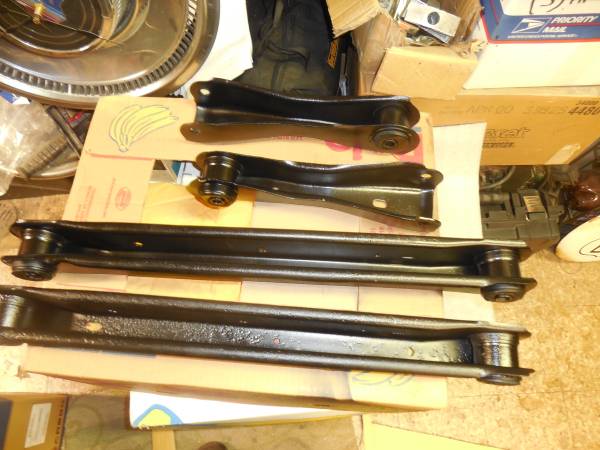 Up for grabs is the set of upper and lower trailing arms off a 1972 Cutlass S I parted out in NC. NY lowers and NK uppers clearly visible. I had them blasted then painted with satin black Rustoleum 2X. Bushings are original but in good shape. Will fit GM A-Body cars from 1966-72. Call if interested. Thanx