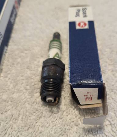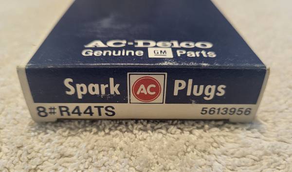 Set of 8 NOS new-in-box AC R44TS old-school green stripe spark plugs. These are marked as p/n 5613956, which superseded the original p/n 5613302. These are true old-stock parts, with a box date of 1986. This eight-pack of plugs was sealed in the box until I opened it for photos.