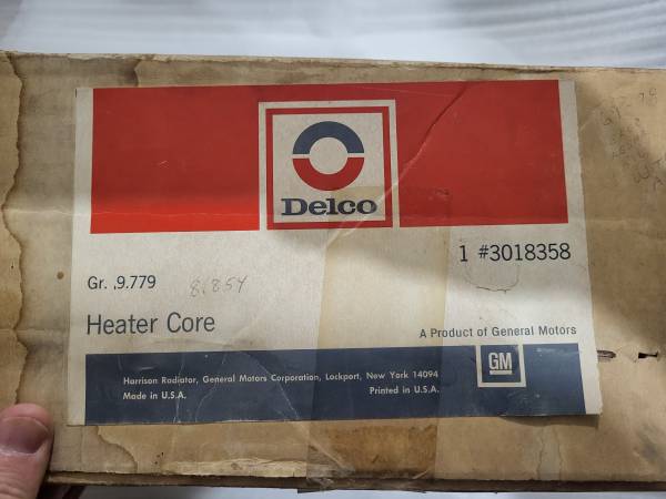 New in-the-box NOS heater core p/n 3018358 for 69-70 full-size Buick WITH AC. This is genuine GM OE part, not aftermarket, and is still sealed in the factory plastic. The box displays the DELCO brand prominently, but small print confirms it is actually made by GM’s Harrison Radiator Division, the guys that made all the OE radiators and heater cores.
