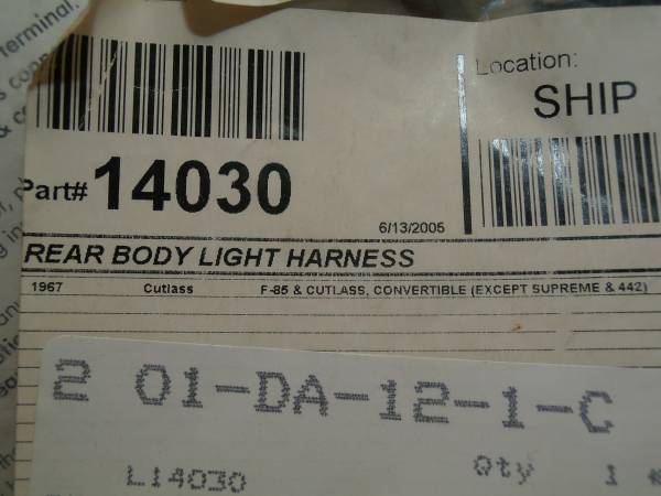 1967 REAR BODY LIGHT HARNESS FOR CUTLASS & F-85 PART #14030 CONVERTIBLE EXC. SUPREME & 442 NEW