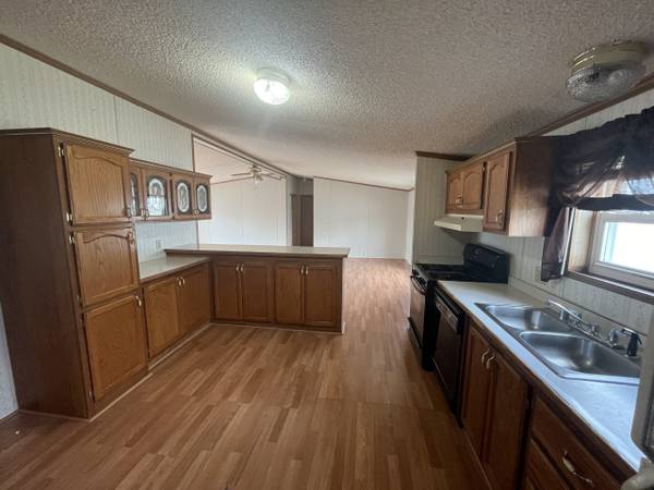 Modern Kitchen: Featuring a plenty of cabinet space, breakfast bar and all new black appliances.