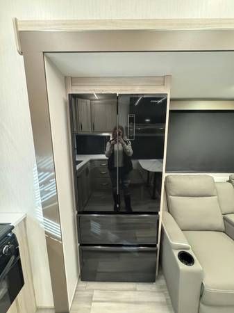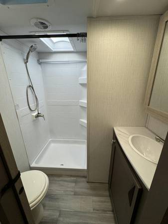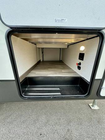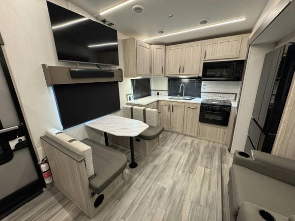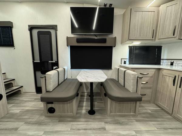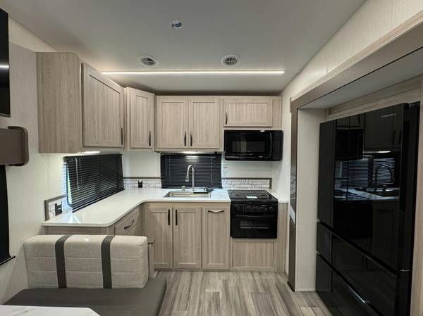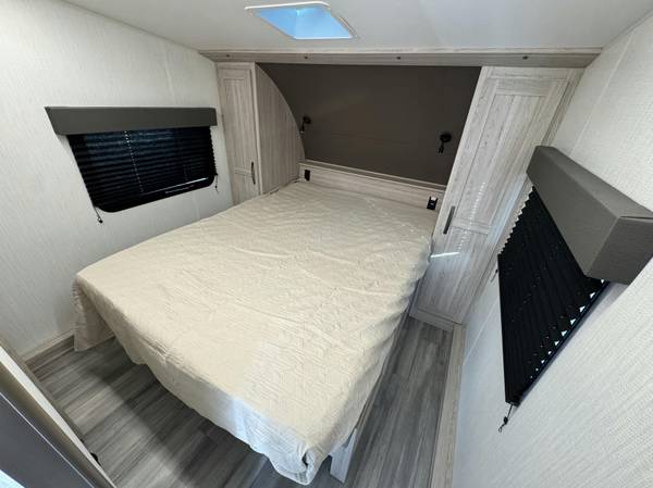 Inside, you’ll find a bright and elegant space with premium furnishings, a true queen bed with hidden storage, and a fully equipped kitchen featuring solid-surface countertops and an air fryer-ready oven. The exterior includes Azdel high-gloss fiberglass, a power awning with LED lighting, and 15K BTU ducted A/C for four-season comfort.