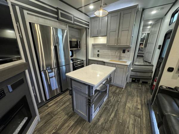 The front bedroom offers a private retreat with its own TV, dresser, and washer/dryer prep, giving you plenty of storage and comfort for extended trips. Built for power sports enthusiasts, the Fuzion 373 includes Keystone’s Adjust-A-Trac tie-downs, Omni-Chill high-efficiency A/C system, and six-point hydraulic leveling for smooth setup every time.