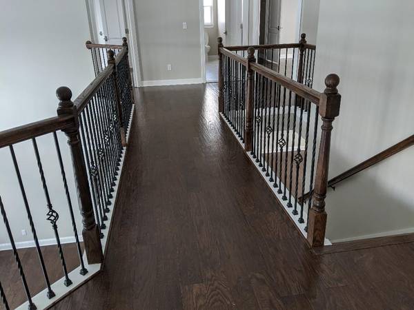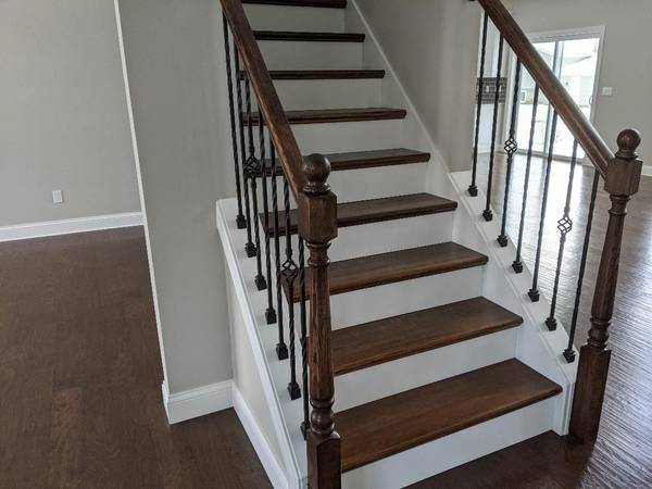4. Building stairs, stair newel post and wrought iron stair baluster installation.