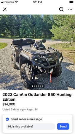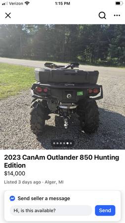 2023 CanAm Outlander 850 Hunting Edition.........Like NEW......Under 150 Miles.......Gas Powered.......Excellently Maintained.........