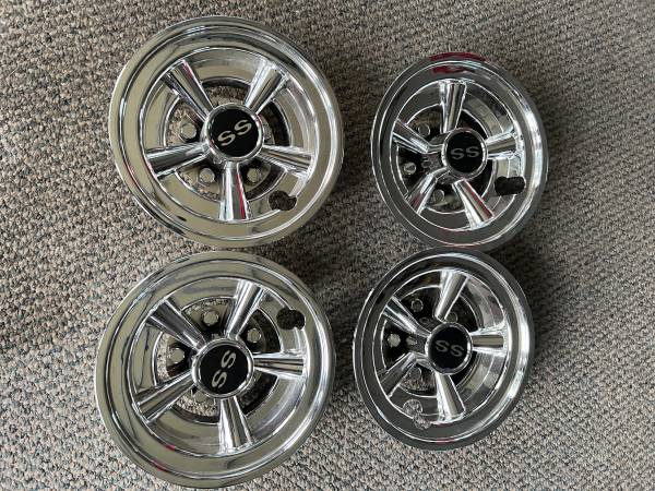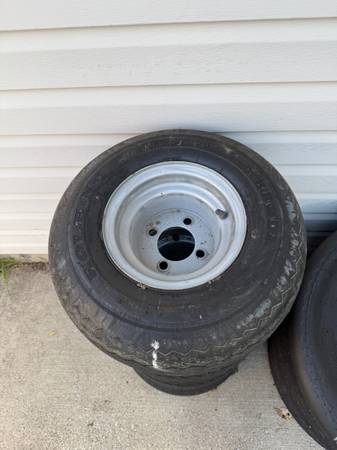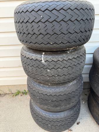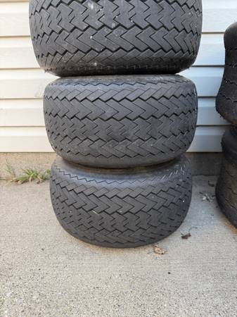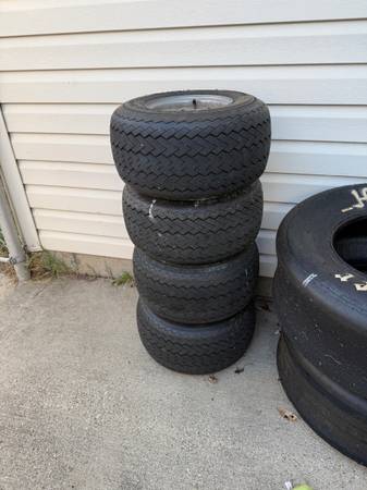 Set of 4 golf cart wheels with good tires and chrome SS covers. Tires have good tread and all 4 hold air, wheels covers are like brand new. Comes with lug nuts if needed.