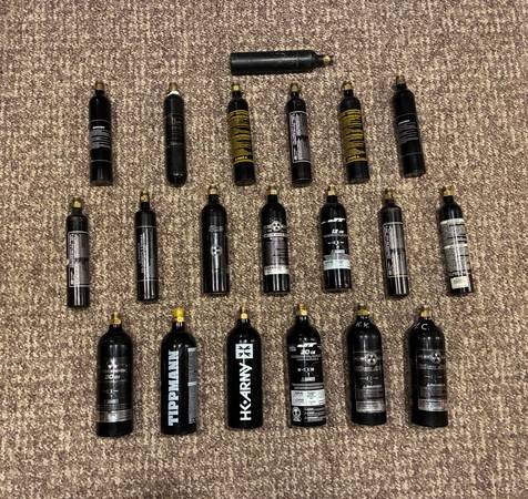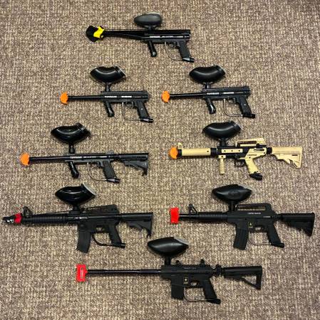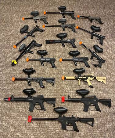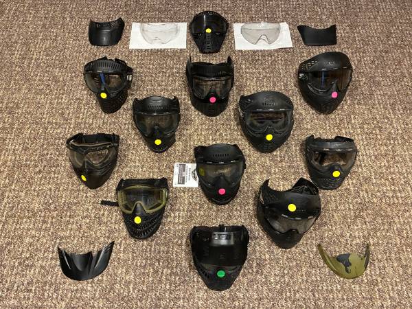 Perfect for a bachelor party, work outing, reunions, start up club etc. All of the markers are in good working order and have been cleaned and oiled. They also have new front and rear o-rings, along with a new ball latch detent. The smaller tanks all have new o-rings but all are expired and need to be hydro tested. However, they have been working just fine. The larger 20# fill tank can fill all of the included tanks and when empty simply exchange it at any Airgas location for about $60. The masks are color coded based on condition where green=great/good, yellow=decent/ok, red=for parts only. The lot comes with 3 1/2 cases of sealed paintballs but they are older. Also included are barrel squeegees, wrench tools, and red and blue team armbands.