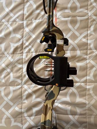Bear Legit right hand compound bow, draw weight 10-70 lbs., draw length 14”-30”, speed 315 fps, mass weight: 3.6 pounds New condition