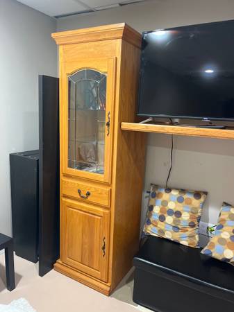 Entertainment center with leaded glass in the doors and adjustable TV shelf in the middle excellent condition.Richard