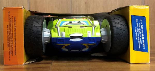 What's fast, fun and flippable? Supercharge your little one's need for speed and taking control with this chunky, two-in-one R/C vehicle. An easy-to-use wireless controller sends this sports car racing forwards or backwards. Race over obstacles to make it flip over and reveal the different color racecar design on the other side! Oversized rubber tires help protect walls, feet and floors. Your toddler's first radio-controlled car is sure to race right to the top of his favorite toy list!