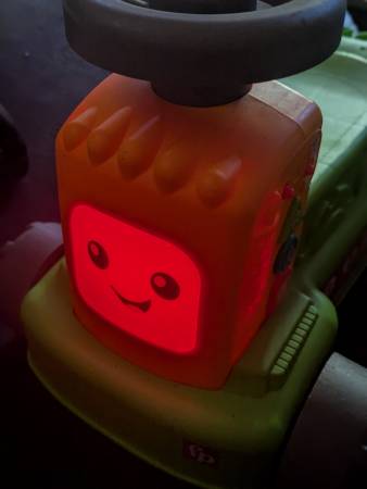 Laugh and Learn Garden Tractor with Fruit Wagon that can be pulled behind or separated. This interactive toy is perfect for promoting cognitive development and enhancing playtime for young children. Colorful Lights and Sounds. Has cute shapes which are not original.