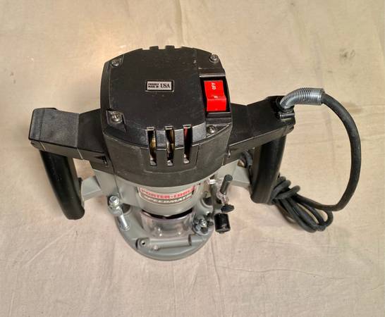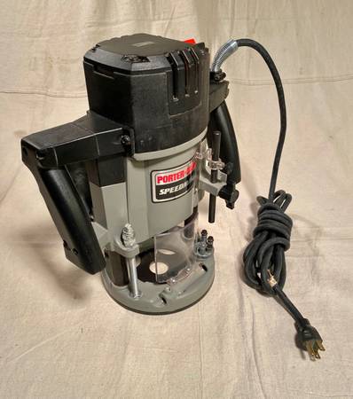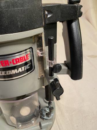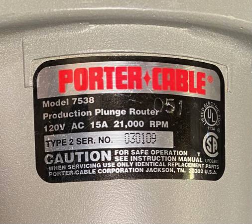 Porter Cable Model 7538 Speedmatic production plunge router. This router is in excellent condition, lightly used in a home shop. 21,000 RPM. Includes soft start feature for smooth starting that eliminated the sudden torque when turning on the router. Made in USA. Includes a 1/2" collet and wrenches to change bits. This is a heavy duty tool, measures 13" tall.