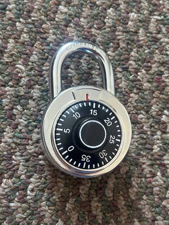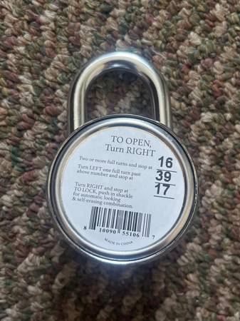 Regular lock with combination on the back. Barely used/minimal scratches.