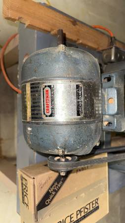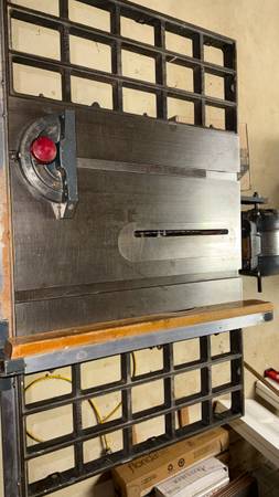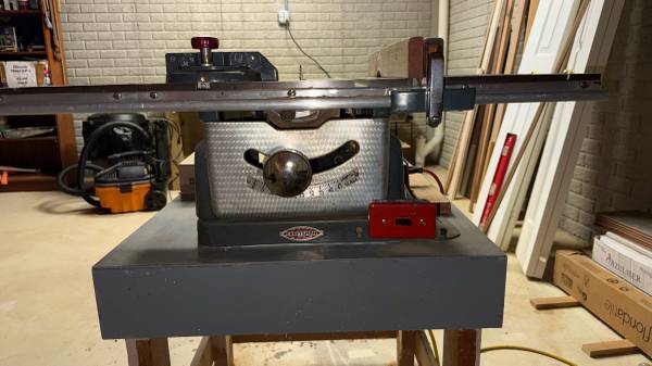 Old school table saw. Heavy AF. Mid-1950’s vintage. Works great! Belonged to an old shop teacher. Comes with motor, 2 extension wings (shown), fence and guide. Also has dado set. Homemade stand.